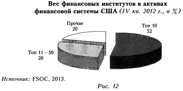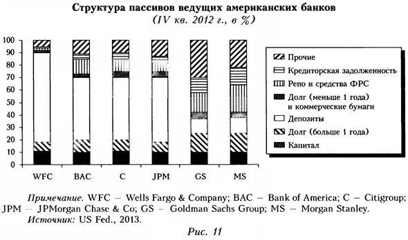 При этом, согласно данным американских регуляторов, если в целом по группе рассматриваемых банков объем деривативов более чем в 25 раз превышает объем активов, то по отдельным крупным банкам, например Goldman Sachs, отмечается 370-кратное превышение, что — с учетом роли данного банка в финансовой системе США и соответственно возможности влиять на характер протекающих в ней процессов — крайне настораживает. На лидирующие по этому показателю 10 американских банков (представляющих почти 60% активов банковской системы США) приходится деривативов на сумму почти 230 трлн долл. (что более чем в 30 раз превышает стоимость их активов). В целом в структуре источников средств (пассивов) ведущих американских банков и банковских холдингов значительную роль играют средства, полученные от ФРС (репо и др.), а также депозиты (хотя у банков с более инвестиционно ориентированным профилем их роль невелика) (см. рис. 11).