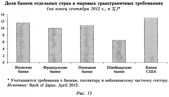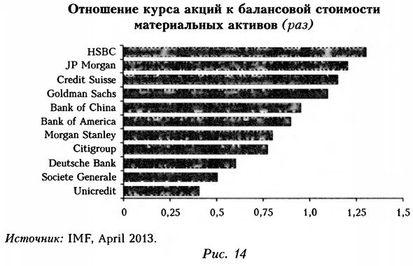 При этом наблюдается большая взаимозависимость самих банков (когда в пассивах и активах каждого из них важную роль играют банки-корреспонденты из той же взаимосвязанной группы). В принципе фактор «круговой зависимости/поруки» не должен уменьшать устойчивость всей системы в целом, однако при этом существенно усложняется (и должен ужесточаться) контроль над участниками, поскольку проблемы одного из них могут быстро сказаться на других и привести к системному кризису, особенно учитывая высокую концентрацию в финансовой системе США (см. рис. 12). ![]() В такой ситуации понятна обеспокоенность участников рынка экономическим положением в странах-партнерах. Проблемы других стран могут создать проблемы в собственной стране, в том числе ввиду большой вовлеченности национальных банков в операции за рубежом (см. рис. 13). ![]() «Доверие к финансовой системе остается хрупким», — отмечает Банк Англии (Bank of England, 2013. P. 64). Вследствие этого рынки продолжают консервативно оценивать акции финансовых учреждений — в ряде случаев ниже их балансовой стоимости (см. рис. 14).