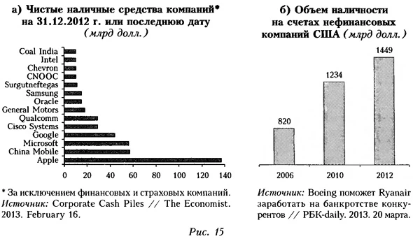 Из-за неуверенности компаний финансового и реального секторов они вынуждены поддерживать значительную долю наличной ликвидности в своих балансах. Эта величина в отдельных случаях может достигать 10% активов (см. рис. 15).