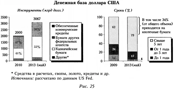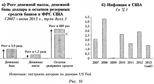 Стремление сохранять ликвидность и ее масштабное накопление в мировой экономике на микро- и особенно на макроуровне могут создавать угрозу инфляции, формирования финансовых пузырей и возникновения иных рисков. В такой ситуации регуляторы при необходимости будут вынуждены ужесточить денежно-кредитную политику (как это имеет место, в частности, в России). О монетизации, инфляции и экономическом ростеВ январе 2013 г. Банк России отметил, что «резкое снижение темпов инфляции, начавшееся в конце 2011 г., не в полной мере соответствовало динамике денежной массы, наблюдавшейся в предшествующие периоды». Сделан вывод, что тенденция к замедлению темпов роста цен может быть неустойчивой и это «давало основание для ужесточения денежно-кредитной политики». Указано, что «замедление темпов роста денежной массы до относительно низкого уровня может оказать значительное сдерживающее влияние на темпы роста цен в 2013 г.» (ЦБ РФ, 2013. С. 37-38). Подчеркнем, что не только в России, но и в мире в целом, после кризиса 2008—2009 гг. (а у нас — и до него) воздействие роста ликвидности на цены было неявным. Масштабные антикризисные меры в большинстве стран сопровождались существенным увеличением эмиссии и должны были вызвать рост цен. Между тем в ряде государств (в первую очередь в Японии) наблюдались дефляционные тенденции, а в других — цены выросли, но незначительно. В частности в США, при самой большой эмиссии, инфляция ниже 2%. Как представляется, это можно объяснить в том числе хранением в ФРС избыточных резервов американских банков. В начале 2007 г. хранившиеся в ФРС резервы банков составляли около 0,003 трлн долл. К концу июня 2013 г. они выросли почти в 600 раз и составили 1,9 трлн долл. Денежная база при этом увеличилась всего в 3,9 раза (с 0,8 трлн до 3,2 трлн долл.), а денежная масса — в /,5 раза (с 7,0 трлн до 10,5 трлн долл.) (см. рис. 16).