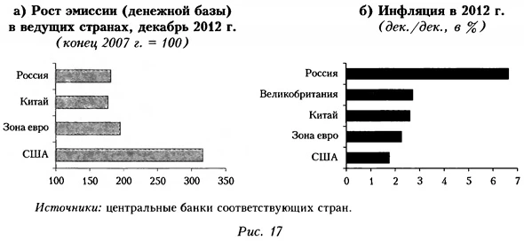 Другими словами, американские банки осуществили масштабную «самостерилизацию» своих финансовых ресурсов. Этому способствует и политика ведущих банков США по формированию больших запасов наличности. Такие меры препятствуют поступлению эмитируемых долларов в экономику и тормозят действие мультипликатора, превращающего денежную базу в соответствующий агрегат денежной массы (в октябре 2008 г. ФРС установила платежи по размещенным в ней резервным требованиям банков и в настоящее время ставка равна 0,25%). Положение России на фоне ряда стран на первый взгляд выглядит менее благополучным (см. рис. 17). Хотя отметим, что достигнутый уровень инфляции самый низкий в новейшей истории страны.