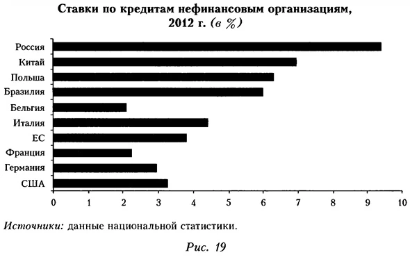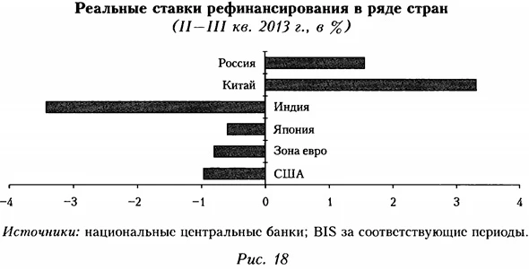 Тот факт, что цены в России отреагировали сильнее на рост ликвидности, должен был послужить обоснованием жестких мер денежного регулирования и поддержания высоких ставок, определяющих стоимость денежных ресурсов (в том числе ставки рефинансирования). Именно такие подходы в нашей стране в первую очередь и применяют (см. рис. 18). Но в Китае на фоне еще более жестких подходов один из самых высоких уровней монетизации, а также очень низкая инфляция. Это (помимо сглаживания эффекта дефлирования) говорит о том, что при правильном подходе экономика может получать необходимые ей финансовые ресурсы без инфляционных рисков.