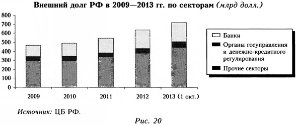 Очевидно, что из-за дешевизны финансовых ресурсов за рубежом устойчиво растет внешняя задолженность российского реального сектора и банков. Она уже превысила 650 млрд долл. (см. рис. 20).