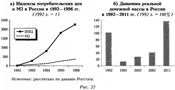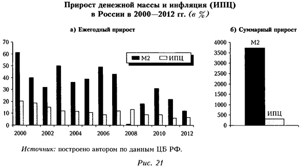Казалось бы, дополнительный рост ликвидности должен «тянуть» цены за собой. Однако в России этого не происходит, причем уже в течение длительного периода. Более того, итоговое расхождение между этими показателями очень значительное (рис. 216). (Даже если фактические цифры по инфляции выше официальных — а это скорее всего так и есть, то итоговая картина принципиально не изменится: все равно многократный разрыв сохранится, лишь немного уменьшится.) О возможности именно такого развития событий мы писали еще 12 лет назад — в период, когда об инфляции говорили или плохо, или ничего. Отмечалось, в частности, что вследствие низкой монетизации российская экономика «демонстрировала способность принимать дополнительные рублевые ресурсы на безынфляционной основе». В связи с этим мы делали вывод, что «немонетизированные операции .. .могут в значительной степени способствовать эффективному расширению капитальной базы экономики» (Ершов, 2000. С. 317—318). Такие выводы и прогнозы были оправданны, учитывая «денежный провал» в первой половине 1990-х годов, когда рост цен почти в 10 раз обогнал рост денежной массы, что привело к ее реальному сжатию на ту же величину (см. рис. 22).