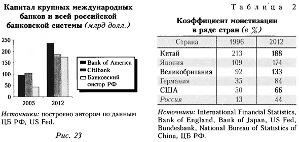 Естественным результатом подобного «монетарного шока» стали неплатежи, бартер, денежные суррогаты и прочие квазиденьги, посредством которых экономика смогла компенсировать возникающие перекосы. Было очевидно, что инфляционные последствия увеличения денежной массы в таких условиях будут ограничены. «Денежное сжатие» привело к снижению капитализации банков и монетизации экономики в целом, которые хотя и выросли в последние годы, но по-прежнему незначительны и могут существенно ограничивать возможности экономического роста (см. рис. 23 и табл. 2).