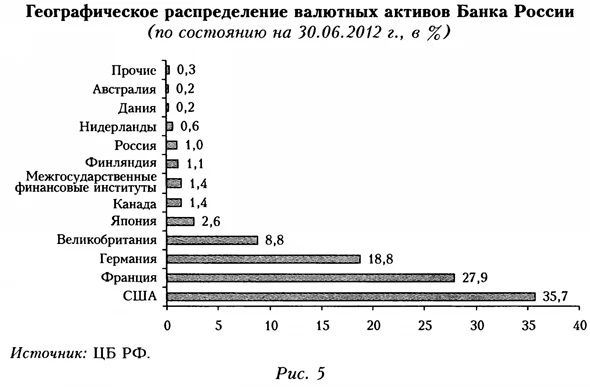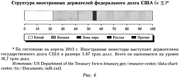 В результате в ряде стран с профицитным бюджетом отмечается устойчивое превышение сбережений над инвестициями, а в странах с дефицитным — недостаточный уровень собственных сбережений относительно расходов (инвестиций). Как следствие, они нуждаются в постоянном привлечении финансирования из-за рубежа (см. рис. 2—3). Таким образом, сложилась устойчивая группа стран — доноров мировых финансовых ресурсов (к их числу относится и Россия) и стран — их реципиентов. Российские регуляторы направляют (размещают) большую часть своих финансовых ресурсов в доллары США, а также в государственные ценные бумаги (которые эмитируют ведущие страны для финансирования своих бюджетов). Наибольшая доля среди получателей российского финансирования приходится на США (см. рис. 4—5). При этом роль России в финансировании бюджета США достаточно заметна (см. рис. 6). Это придает дополнительный геополитический вес нашей стране и усиливает ее позиции в обеспечении своих интересов в отношениях с США. ![]()