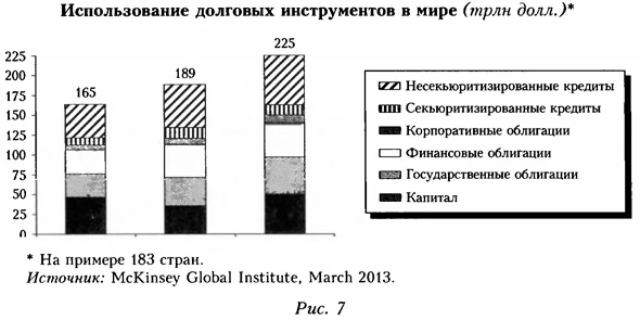 В целом для решения долговых проблем и проведения антикризисных мер требуется масштабное финансирование. В результате в мировой финансовой системе устойчиво растет объем долговых инструментов. Отметим, что некоторый рост капитала (это в принципе выступает стабилизирующим фактором) существенно отстает от динамики долгов, в целом увеличивая неустойчивость мировой финансовой системы (см. рис. 7). ![]() ![]() ![]()