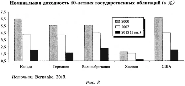 В результате преобладающий на рынке уровень доходности не удовлетворяет его участников. Они вынуждены вновь покупать высокодоходные (но одновременно высокорискованные) инструменты для улучшения показателей своей деятельности. По оценкам Банка Англии, «риски могут возрасти, если стремление к доходности усилится, а стоимость активов во все большей мере будет иметь неверную ценовую оценку» (Bank of England, 2013. P. 64). Ценовым перекосам содействуют и масштабные покупки гособлигаций центральными банками, что не позволяет рынку правильно оценить их стоимость. Возможность реализации предкризисных рисков сохраняется еще в одной сфере — использования производных инструментов (деривативов), которые сыграли серьезную дестабилизирующую роль в ходе последнего кризиса. Здесь в настоящее время наблюдается достаточно высокая активность (см. рис. 10).