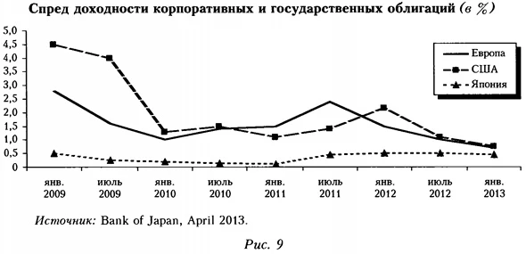 Масштабное финансирование бюджетных дефицитов ведущими странами при одновременном удешевлении стоимости финансовых ресурсов вновь выводит на первый план одну из предкризисных зон риска — эмиссию «мусорных» облигаций, объем которых стабильно увеличивается. Это вызвано устойчивым снижением уровня доходности на рынках многих стран. Причем снижение доходности госинструментов повлекло за собой падение доходности и корпоративных бумаг (см. рис. 8 — 9). ![]()
