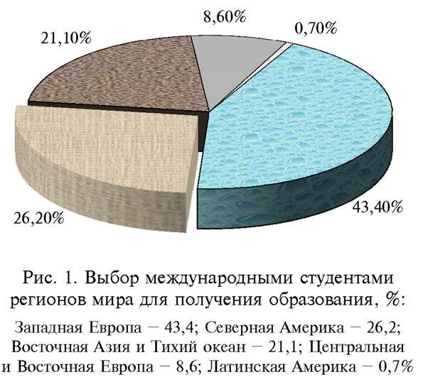 Кушнева О.А. Рудская И.А. Экспорт образования — актуальное требование современного обществаВремя, в котором мы живем, характеризуется резким возрастанием роли науки во всех сферах жизни общества, ростом потребности в наукоемких технологиях. Как их создание, так и использование предъявляют повышенные требования к уровню общей образованности людей и качеству их профессиональной подготовки. Если в середине XX в. лишь 20 % рабочих мест требовали высокой квалификации персонала, то по оценкам экспертов уже сегодня доля таких рабочих мест составляет 60 %, а в дальнейшем будет еще выше. Это потребует адекватной реакции со стороны системы высшего образования для перехода на новый технологический уровень общественного производства. Именнопоэтому в наиболее дальновидных странах мира, например, в Японии, планируют переход к системе всеобщего высшего образования. Все возрастающая роль интеллектуализации общества обусловлена повышением требований к качеству человеческого капитала. Многие современные исследователи [5—7; 13—18] подчеркивают, что высококлассное высшее образование превратилось в ценный продукт, востребованный на международном рынке. Все больше молодых людей стремятся получить высшее образование в ведущих университетах мира. По данным ЮНЕСКО за 2010 г. за пределами своих стран обучались более 2,6 млн чел., при этом их предпочтения по регионам обучения распределились следующим образом (рис. 1).