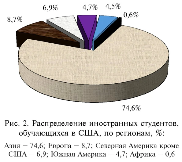 Рис. 1 показывает, что наиболее привлекательными для обучения, с позиции иностранных студентов, являются классические университеты Старого света. Значительно увеличили свое присутствие на рынке образовательных услуг университеты Азиатско-Тихоокеанского региона, составляя серьезную конкуренцию университетам США. Экспорт образования для ведущих государств является системной целенаправленной политикой, рассчитанной на долгосрочную перспективу. Граждане разных стран, получившие образование в одном университете, связаны в течение жизни студенческим братством. Поднимаясь в своей стране со временем до уровня интеллектуальной и политической элиты, бывшие студенты сохраняют теплые воспоминания о годах учебы, а нередко — дружеские контакты со своими «однокашниками» и лояльное отношение не только к университету, но и к стране в целом. У молодых людей формируется эталон образа жизни, определенные идеологические и нравственные установки. Именно поэтому интернационализация и глобализация высшего образования как актуальные тенденции современного мира, безусловно, должны активно поддерживаться государством, в том числе и в плане финансирования. Анализ мирового опыта в области экспорта образованияПомимо укрепления геополитических позиций государства экспорт образования может приносить и ощутимые доходы: по данным исследований Центра международного высшего образования при Бостонском колледже [13] в 2013 г. около трех миллионов студентов обучались за пределами собственной страны, а ежегодный оборот мирового рынка образовательных услуг превысил 75 млрд долл. Лидирующее положение в сфере образовательных услуг, которые приносят стране значительный доход, занимают США и Великобритания. По данным Института международного образования в 2012—2013 учебном году в американских вузах обучалось около 820 тыс. иностранных студентов со всех географических регионов мира (рис. 2), что добавило в экономику США 24 млрд долл.