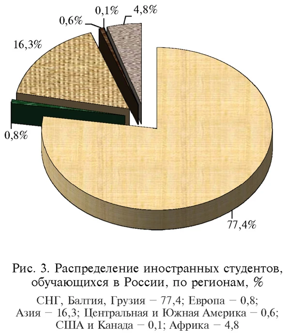 В табл. 1 прослеживается тенденция нарастания количества иностранных студентов, получающих образование в вузах России. По сравнению с 1990 г., в 2013 г. эта цифра увеличилось на 75,5 тыс. чел. (85 %). Однако если учесть, что в 1990 г. и нынешние страны СНГ и другие страны ближнего зарубежья еще являлись республиками Советского Союза, это означает, что 89,3 тыс. студентов были посланцами из так называемых сегодня стран дальнего зарубежья. Значит, Россия пока не восстановила прежние позиции на мировом рынке образовательных услуг, утраченные в годы глубочайшего экономического и политического кризиса. Более наглядно эта структура представлена на рис. 3.