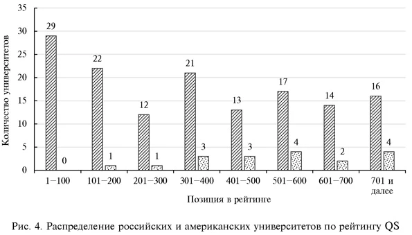 Составлено по данным QS World University Ranking [21]. Как видим из табл. 5, ближе всех к заветной сотне находится МГУ им. М.В. Ломоносова, но за последние три года университет ухудшил свои позиции рейтинге, перейдя со 112-го места на 120-е. И это несмотря на то, что итоговая балльная оценка выросла с 61,3 балла в 2011 г. до 63,9 балла в 2013 г. Однако такого роста оказалось недостаточно даже для того, чтобы сохранить позиции: в этой рейтинговой группе требуются совсем другие усилия.СПбГУ, следующий за лидером вуз, занимает 240-е место, набрав 45,9 балла. В четвертой сотне представлены три российских университета: МГТУ им. Н.Э. Баумана, Новосибирский государственный университет и МГИМО с суммой баллов 38, 36,2 и 33,8 соответственно. Еще два университета обладают хорошим потенциалом — это Московский физико-технический институт и Санкт-Петербургский государственный политехнический университет, которые хотя и вошли в рейтинг QS только в 2013 г., но сразу заняли достойные для новичков позиции: 443 (30,3 балла) и 457 (30,0 баллов) места соответственно, обогнав Университет дружбы народов, который с суммой 28,4 балла занимает 495 строку в рейтинге. Остальные российские университеты располагаются на арьергардных местах, для которых суммарный балл по итогам 2013 г. даже не рассчитывался. На рис. 4 приводится сопоставление распределения российских и американских университетов по рейтингу QS.