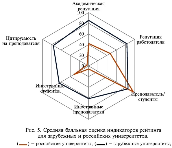 Составлено по данным QS World University Ranking [21]. На рис. 5 приведено графическое сравнение средних баллов по зарубежным и отечественным университетам на основании данных табл. 6 и 7.