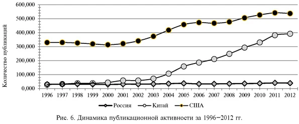 Из рис. 5 видим, что наилучшую среднюю оценку наши университеты имеют по индикатору соотношение преподавательского состава к числу студентов. Именно этот показатель и обеспечил большинству отечественных университетов возможность попасть в рейтинг, так как по соотношению преподавателей и студентов 10 из 18 наших университетов занимают позицию в первой сотне. Нормативное соотношение численности профессорско-преподавательского состава к студентам в размере 1:10 определено постановлением Правительства «Об утверждении Программы экономии государственных средств» в 1998 г. Сейчас Правительство РФ готовит переход к нормативно-подушевому финансированию государственных вузов, а следовательно, будут разрабатываться и новые нормативные соотношения преподавателей и студентов. Если к разработке этих нормативов чиновники станут подходить с позиций еще большей экономии, то они лишат многие российские вузы, стремящиеся попасть в рейтинг QS, того единственного преимущества, которое они пока имеют. Заметим, что в Массачусетском технологическом институте — лидере мирового образования соотношение преподавательского состава к числу студентов равняется 1 : 8 [20], причем по данному показателю МТИ занимает только 14-е место. Сравнение диаграмм на рисунке наглядно показывает и самое слабое место отечественных университетов — индекс цитируемости. По этому индикатору даже лидер — МГУ им. М.В. Ломоносова набрал только 6,3 балла, а ведь удельный вес этого показателя в общей балльной оценке составляет 20 %. Для сравнения: худший из университетов первой сотни по индексу цитируемости — Пекинский государственный университет имеет 46,5 балла. А если учесть, что повышение данного показателя на 10 баллов увеличивает итоговую оценку в рейтинге на 2 балла, нетрудно сосчитать, что МГУ им. М.В. Ломоносова достаточно увеличить цитируе-мость менее чем на 30 баллов, чтобы оказаться среди ста лучших университетов мира. Проблемы публикационной активности российских ученыхОчевидно, что повышение показателя цитируемости поможет нашим университетам улучшить свои позиции в рейтинге. Мы фиксируем внимание на этом, поскольку именно цитируемость является наукометрическим индикатором актуальности и качества проводимых исследований, а следовательно, напрямую участвует в формировании и самого весомого индикатора рейтинга QS — академической репутации. Говоря о цитируемости, не следует упускать из виду такой фактор, как публикационная активность. Очевидно, что чем выше публикационная активность автора, тем больше шансов, что его материалы найдут своего читателя, будут кем-то использованы в работе и процитированы в печати.Исследовательской группой SCImago, которая занимается презентацией и поиском информации, основываясь на базе данных Scopus, создан специальный ресурс, позволяющий рассмотреть публикационную активность в различных аспектах. По данным этой группы за период с 1996 по 2012 г. в базе данных Scopus зафиксировано около 30 млн научных работ. Лидером по количеству публикаций выступает США — 7 063 329 статей, что составляет 24,05 % мировой научной прессы; второе место занимает Китай — 2680395 статей и 9,12 %; Россия в этом списке на 12-м месте — 586646 научных публикаций и 2 %. На рис. 6 представлен график, отображающий динамику роста количества публикаций за 1996—2012 гг. по данным SJR [22].