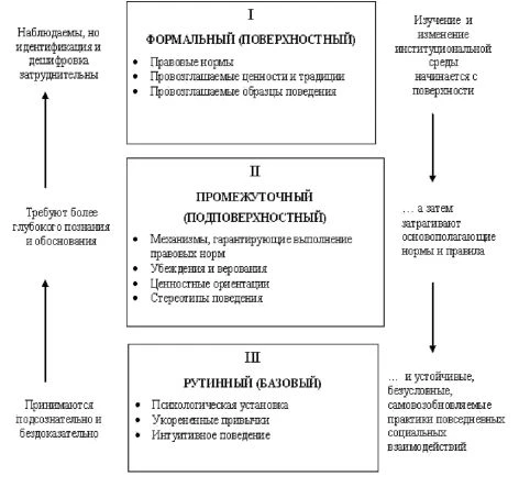 Рисунок. Уровни институциональной среды Исследователи институционального устройства общества часто затрагивают лишь основополагающие нормы и правила как формальные, так и неформальные. Восприятие этих институтов происходит на уровне сознания и обусловлено желаниями людей. Нередко уже на этом уровне познания обнаруживаются несоответствия и противоречия между видимым, или поверхностным, слоем институциональной среды и ее реальным содержанием. Хозяйственная повседневность людей во многом имеет рутинный характер. Это означает, что, принимая некоторые решения, или предпринимая определенные действия, хозяйствующее лицо даже не задумывается о том, почему он это делает, и делает так, а не иначе. Действия человека и его взаимоотношения в хозяйственной сфере часто предопределены установками подсознательного характера, выработанными через культуру, воспитание, обучение, подражания и привычки. Иными словами, у людей постепенно, в течение всего процесса социализации формируются прочные стереотипы мышления и поведения, которые служат им ориентирами при решении повседневных экономических проблем, внося в их взаимоотношения определенность, предсказуемость и понимание друг друга. Чтобы раскрыть всю значимость и сложность взаимодействия между институтами и экономической деятельностью, необходимо изучить глубинные механизмы, направляющие хозяйственное поведение людей и представленные в виде устойчивых и воспроизводящихся каждый день психологических установок, интуитивных предположений, привычек, ролевых ожиданий, предпочтений, ценностных ориентиров, которые в значительной степени находятся вне сферы сознательных решений и контроля. Этот уровень институциональной среды -наименее исследованный. Одним из авторов ранее была предпринята попытка реализации многоуровневого подхода к анализу процесса институционализации фермерства и его интеграции в существующую институциональную среду села в пореформенной России [2]. Институциональная система представляется авторам как открытая нелинейная система, состоящая из разнотипных, параллельно сосуществующих в едином институциональном пространстве и взаимодействующих между собой «институциональньгх миров», т.е. институциональн^іх структур. Моноструктурная институциональная система не способна регулировать всю гамму противоречивых интересов участников хозяйственной жизни и все разнообразие типов их взаимоотношений, а следовательно, не позволяет обеспечить устойчивость развития сельской экономики. Иными словами, любой субъект сельской экономики (семейное или фермерское хозяйство, сельскохозяйственное предприятие, сельская администрация) объективно вынужден действовать одновременно в рамках различных институциональных структур. Под институциональной структурой понимается совокупность институтов, которая формирует определенным образом упорядоченную целостность. Соответственно и цели, ориентиры и поведение субъектов аграрной экономики формируются под воздействием различного типа институтов. Институциональные структуры могут как возникнуть спонтанно, в ходе длительного исторического развития и под воздействием целого комплекса факторов и условий, так и создаваться осознанно, целенаправленно, в соответствии с определенным планом, программой. На на