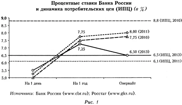 д. э. н., ведущий научный сотрудник Института макроэкономических исследований (ФБНУ ИМЭИ) Киюцевская А.М. к. э. н., старший научный сотрудник Центра изучения проблем центральных банков Российской академии народного хозяйства и государственной службы при Президенте РФ (РАНХиГС) эксперт Института экономической политики имени Е.Т. Гайдара В последнее десятилетие зависимость российской экономики от мирохозяйственных процессов существенно возросла. Возможности и ограничения ее развития стали определяться ситуацией не только на сырьевых, но и на мировых валютных и финансовых рынках, напряженность на которых подорвала внешнюю основу быстрого роста российской экономики в начале и середине 2000-х годов — растущих цен на энергоносители, дешевых и «длинных» финансовых ресурсов. Несмотря на быстрое, уже к концу 2011 г., восстановление докризисного объема производства ВВП, внешние и внутренние изменения после кризиса 2008-2009 гг. трансформировали параметры монетарного финансирования российской экономики, ослабив конкурентные преимущества и инвестиционную привлекательность страны как реципиента отечественных и зарубежных финансовых инвестиций. Это выступило одним из факторов замедления экономического роста, переросшего в стагнацию еще до внешних шоков 2014 г. Посткризисное монетарное финансирование РоссииВ 2011-2013 гг. условия функционирования российской экономики стали существенно отличаться от условий как докризисных «тучных» лег, гак и периода быстрого, но непродолжительного восстановительного роста. До кризиса экономическая активность в значительной степени была связана с исключительно благоприятной внешней конъюнктурой, а во время кризиса и посткризисного восстановления опиралась на масштабную государственную поддержку, объем которой был позднее значительно сокращен. При этом внешние условия оказались менее комфортными, чем прежде. В российской экономике, где в докризисный период основным источником расширения денежного предложения выступал прирост чистых иностранных активов Банка России, при изменении внешнеэкономической конъюнктуры относительный объем монетарного финансирования экономики сократился, а стоимость кредитования регулятора, напротив, возросла. Несмотря на растущую потребность кредитных организаций в привлечении финансовых ресурсов Банка России, стоимость его заемных средств постепенно перемещалась в область реально положительных значений. Если по итогам 2010 г. вся кривая реальных процентных ставок регулятора была отрицательной — при росте потребительских цен на 8,8% (декабрь к декабрю) ставка по кредитам «овернайт», формировавшая верхнюю границу коридора процентных ставок Банка России, равнялась 7,75% годовых, — то в последующие годы, вслед за изменением ставок и инфляции, эти соотношения начали меняться. Уже в 2011 г. стоимость большей части заемных средств регулятора переместилась в область положительных значений (рис. 1).
