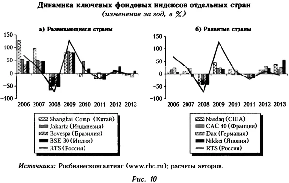 Глобальные последствия монетарной экспансииВ глубоко интегрированной мировой экономике с тесными торговыми и финансовыми взаимосвязями смягчение монетарной политики, в первую очередь ключевым игроком, диктующим «правила игры» на мировой арене (США), воздействовало на все составляющие экономической деятельности других стран. Это обусловило дополнительные требования к их конкурентоспособности и инвестиционной привлекательности. Реализация мягкой монетарной политики в ведущих западных странах побуждала инвесторов к поиску либо надежных, хотя и с невысокой доходностью, но гарантирующих рост в перспективе, финансовых инструментов, какими выступают активы развитых стран, либо рискованных, но более доходных активов развивающихся стран. Следствием монетарной экспансии в развитых странах стал стремительный рост фондовых индексов, превысивший динамику даже докризисного 2006 г., когда еще не проявились первые признаки будущих проблем, позже переросших в глобальный финансово-экономический кризис. Так, американский Nasdaq в 2012-2013 гг. ежегодно прирастал в среднем на 26,6% по сравнению с 9,5% в 2006 г., японский Nikkei — на 38,8 против 6,9, а германский Dax — на 27,3 против 23,5% соответственно (рис. 10).