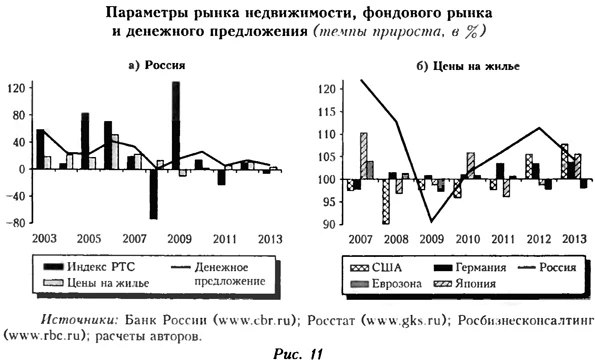 Закономерным следствием относительного сокращения объема монетарного финансирования в результате проведения «умеренно жесткой» (Банк России, 2014) политики Банка России на фоне масштабной монетарной экспансии органов денежно-кредитного регулирования крупнейших развитых стран стало ослабление инвестиционной привлекательности российской экономики. Если в 2007-2010 гг. взлеты и падения российского индекса РТС, двигавшегося в русле мировых трендов, существенно превышали амплитуду колебаний зарубежных аналогов, то уже в 2011 г. российский фондовый рынок утратил свою привлекательность даже для высокорискованных вложений. РТС снизился на 21,9%, уступив динамике только индийского BSE 30 (падение на 24,6%). В дальнейшем на фоне ускорения роста фондовых индексов развитых стран крупнейшие развивающиеся страны также утратили свою привлекательность. Позитивную динамику удалось сохранить только индийскому BSE 30, прибавившему 9% за 2013 г. (бразильский Bovespa и китайский Shanghai Comp, снизились соответственно на 15,8 и 7%, а российский РТС — на 5,5%). Аналогичные тенденции характеризуют и состояние рынка недвижимости. В России рост цен на жилье, достигнув в 2012 г. посткризисного максимума (11,4%), в 2013 г. вновь замедлился (4,2%). В США благодаря масштабным стимулирующим мерам он продолжил ускоряться в 2013 г. (7,7%). Восходящие тренды сформировались и в Японии, где цены на жилье в 2013 г. выросли на 5,6% (рис. 11).
