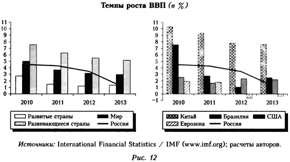 Устойчивость восходящего ценового тренда на рынке недвижимости в США, Японии и Германии служила значимым индикатором, определяющим привлекательность инвестирования не только в эту сферу, но и в экономику страны в целом. В условиях высокой мобильности международного капитала более низкий рост цен на недвижимость и акции крупнейших корпораций в России по сравнению с другими странами в совокупности с устойчивым замедлением общеэкономической динамики побудил инвесторов к поиску более доходных или более надежных инструментов вложения финансовых средств. Поэтому масштабный вывоз капитала из России и вложение его в зарубежные активы оказались закономерной реакцией на происходящие в российской и мировой экономике процессы. Одним из факторов, обусловивших эти различия в движении капитала и динамике производства, стало относительное сокращение объема монетарного финансирования российской экономики в посткризисный период, что принципиально отличается от ситуации в развитых странах. За три года рост российской экономики замедлился с 4,5% в 2010 г. до 1,3% в 2013 г., что уступает динамике не только развитых стран, но и мировой экономики в целом. Уже в 2013 г. Россия существенно отставала по темпам экономического роста и от крупнейших развивающихся стран. Так, в 2013 г. ВВП Бразилии увеличился на 2,5%, Индии — на 4,7, Китая — на 7,6% (рис. 12).