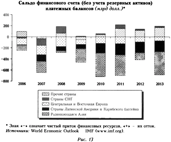 В условиях сохраняющейся на мировых финансовых рынках высокой неопределенности, возросшей волатильности российского рубля и его обесценения относительно мировых валют (за 2012 г. на 5,5% и за 2013 г. на 2,4%) инвестирование в российскую экономику стало неоправданно рискованным. В результате при сохранении российской экономикой позиции чистого кредитора остального мира основными его донорами с 2011 г. выступают банки и нефинансовые корпорации. Напротив, в докризисный период именно эти секторы обеспечивали чистый приток внешних заимствований, а чистый вывоз был связан с масштабными валютными интервенциями, проводившимися в рамках управляемого плавающего валютного курса, то есть подавляющая часть оттока ресурсов в разрезе секторов происходила по каналу Банка России. Подчеркнем, что чистый вывоз финансовых средств как нефинансовыми корпорациями, так и банками обусловлен не столько изменениями курсовой политики Банка России (хотя и это имело место), сколько значительным снижением инвестиционной привлекательности российской экономики, в том числе для ее резидентов. В развивающихся странах стремление инвесторов минимизировать уровень риска привело лишь к сокращению чистого притока финансовых ресурсов (без учета изменения резервных активов). Его величина снизилась с посткризисного максимума 659 млрд долл. в 2010 г. до 475 млрд и 272 млрд долл. соответственно в 2011 и 2012 гг. Опасения относительно скорого сворачивания программ монетарного стимулирования, прежде всего ФРС США, повысили доходность инвестирования, в том числе в высокорискованные развивающиеся экономики. Как следствие, в 2013 г. величина чистого ввоза капитала в эти страны вновь возросла, достигнув 494 млрд долл. (рис. 13).