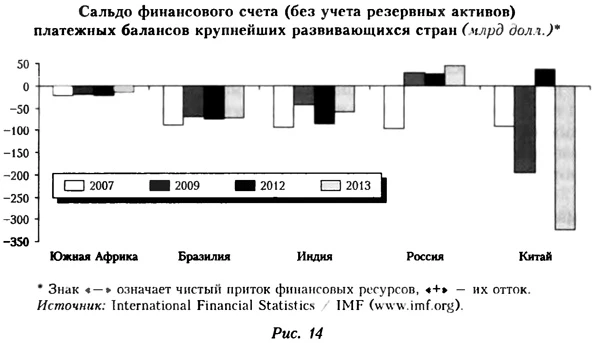 В крупнейших развивающихся странах после кризиса были превышены докризисные объемы чистого притока иностранного капитала. В число этих стран входят не только Китай, где монетарный регулятор поддерживает низкий обменный курс, но и такие крупные страны, как Бразилия, Индия и Южная Африка, обменные курсы которых формируются в рамках плавающего режима. В Бразилии чистые поступления по финансовому счету (без учета резервных активов) платежного баланса, в предкризисном 2007 г. превышавшие 88 млрд долл., в 2011 г. возросли до максимального значения 110,8 млрд долл. Аналогичная ситуация в Индии: посткризисного максимума чистый приток финансовых ресурсов достиг в 2012 г., составив 85,6 млрд долл., что лишь незначительно уступает уровню 2007 г. (94,4 млрд долл.) (рис. 14). Чистый вывоз финансовых ресурсов из российской экономики в 2013 г. увеличился до 45 млрд долл., что не только превышает показатели предыдущего года (25,7 млрд долл.), но и принципиально отличается от направления его движения в предкризисный год. Размер чистого ввоза иностранного капитала в 2007 г. был максимальным за всю историю российской экономики, составив 97,1 млрд долл. Таким образом, Россия даже через пять лет после острой фазы кризиса единственная из крупных развивающихся экономик оставалась нетто-кредитором остального мира (без учета валютных операций монетарных властей) (см. рис. 14).