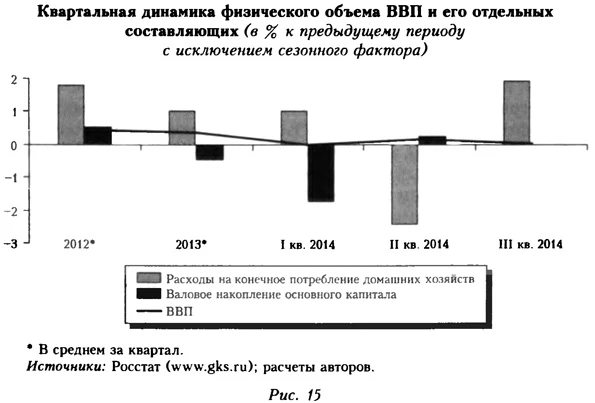 Такая ситуация сохранилась вплоть до 2014 г., когда негативные тенденции в российской экономике были усугублены внешними шоками. Первый шок — влияние санкций Запада, вызванных геополитической напряженностью в связи с событиями на Украине. Санкции нацелены не только на осложнение производства в топливно-энергетическом комплексе, что вполне ожидаемо, но и на создание финансовых преград. Это, во-первых, санкции против нефтегазовых гигантов («Роснефть», «Транснефть», «ЛУКойл», «Газпром», «Газпром нефть» и «Сургутнефтегаз»), ограничивающие не только поставки товаров и технологий, необходимых для разработки нефтяных месторождений, но и доступ к внешним источникам фондирования. Во-вторых, запрет на операции с ценными бумагами, выпущенными российскими банками, в капитале которых на долю государства приходится более 50% (Сбербанк, ВТБ, Внешэкономбанк, Газпромбанк, Россельхозбанк). Ограничительные меры наложены на финансовые инструменты сроком обращения свыше 90 дней, а в отдельных случаях — даже свыше 30 дней. Таким образом, крупнейшим российским банкам закрыт доступ не только к долго-, но и отчасти к краткосрочным внешним финансовым ресурсам. Этим был нанесен существенный ущерб инвестиционной привлекательности страны, что усилило опасения инвесторов относительно перспектив развития российской экономики. Как следствие, только за 2014 г. банки и прочие секторы изъяли из российской экономики 130,5 млрд долл., что лишь незначительно уступает максимальным показателям в кризисном 2008 г. (133,6 млрд долл.). Вторым внешним шоком стало падение цен на нефть на мировых рынках. Ожидания негативных последствий снижения нефтяных котировок, подрывающего финансовую устойчивость российской экономики и ухудшающего перспективы ее дальнейшего развития, оказали существенное давление на национальную валюту. Опасения дальнейшего ослабления рубля в совокупности с инфляционными ожиданиями спровоцировали ажиотажный всплеск внутреннего спроса, в первую очередь потребительского. Так, в III квартале 2014 г. расходы на конечное потребление домашних хозяйств (с исключением сезонного фактора) возросли на 1,9% к предыдущему кварталу, после снижения во II квартале на 2,4% в аналогичном исчислении. После падения в I квартале 2014 г. на 1,7% к предыдущему периоду (с исключением сезонного фактора) во II-III кварталах приостановилось снижение валового накопления основного капитала, которое продолжалось на протяжении целого года, начиная со II квартала 2013 г. (рис. 15).