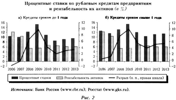 Во второй половине 2013 г. Банк России существенно трансформировал систему процентных ставок. Несмотря на то что ключевая процентная ставка была установлена на уровне 5,5% годовых, что соответствовало ставкам по инструментам абсорбирования и предоставления ликвидности на аукционной основе сроком на 1 неделю, большинство процентных ставок регулятора в реальном выражении осталось в области положительных значений. Заметно, до уровня операций по предоставлению ликвидности постоянного действия сроком на 1 день, была снижена только процентная ставка по кредитам «овернайт». Как следствие, к концу 2013 г. изменился лишь угол наклона кривой процентных ставок Банка России. При значительном снижении краткосрочной ставки «овернайт» на 1,75 п. п. — с 8,25 до 6,5% годовых — ставки по финансовым ресурсам, предоставляемым сроком на 1 год, снизились только на 0,75 п. п. — до 7,25% годовых. В докризисные годы при масштабном притоке иностранной валюты средняя стоимость кредитных ресурсов банков в реальном выражении располагалась в области отрицательных значений. После кризиса процентные ставки для конечных заемщиков в реальном выражении стали положительными, следуя за основными ставками по инструментам предоставления ликвидности Банком России. Процентная ставка по кредитам, предоставленным организациям на срок до 1 года, скорректированная на динамику потребительских цен, в 2013 г. возросла до 2,8% по сравнению с 1,8% годовых в 2010 г., а на срок свыше 1 года — до 4,7% годовых (2,9% в 2010 г.). Для сравнения: в предкризисном 2007 г. процентные ставки по краткосрочным и долгосрочным кредитам в реальном выражении были отрицательными и равнялись соответственно 1,7 и 0,4% годовых. Более того, в номинальном выражении процентные ставки по кредитам предприятиям превысили рентабельность их активов1. В таких условиях использовать заемные средства для финансирования хозяйственной деятельности становится невыгодно. В докризисные годы низкие процентные ставки поддерживали привлекательность кредитных ресурсов как источника финансирования потребительского и инвестиционного спроса. Например, в 2006-2007 гг. рентабельность активов превышала стоимость краткосрочных заемных средств соответственно на 1,8 и на 0,4 п. п. В период кризиса уровень процентных ставок превысил рентабельность активов. Несмотря на сокращение этого разрыва после острой фазы кризиса, в 2012 г. при дальнейшем снижении доходности хозяйственной деятельности и возобновившемся удорожании заемных средств он вновь начал увеличиваться (рис. 2).