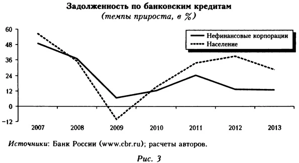 Аналогичным был вектор движения ставок по долгосрочным рублевым кредитам. В условиях возобновившегося в 2012 г. повышения стоимости кредитных ресурсов, предоставляемых предприятиям на срок свыше 1 года, при снижении рентабельности их активов разрыв между этими показателями в 2013 г. увеличился до 5,4 п. п. (5,1 п. п. в 2012 г. и 3,9 п. п. в 2011 г.). Дороговизна внутренних долгосрочных кредитных ресурсов и в докризисные годы определяла невыгодность их использования для финансирования инвестиционной деятельности. Но тогда величина разрыва была незначительной: в 2006 г. она составляла 0,3 п. п., в 2007 г. — 1,1 п. п. Однако если в «тучные» годы дороговизну внутренних долгосрочных источников финансирования удавалось компенсировать за счет дешевых внешних заимствований, то в посткризисных условиях, когда внешние рынки открылись только для наиболее крупных и надежных российских заемщиков, стоимость заемных ресурсов в экономике стала в большей степени определяться объемами и ценой монетарного финансирования Банка России. Повышение не только номинальной, но и реальной стоимости заемных средств при сокращении доступа к дешевым внешним источникам фондирования существенно ограничило возможности экономических агентов инвестировать в основные фонды и расширять хозяйственную деятельность. Снижение привлекательности внутренних заимствований стало одним из факторов замедления динамики задолженности нефинансовых корпораций по банковским кредитам, темп роста которой снизился до 13% в 2012-2013 гг. по сравнению с 24% в 2011 г. В 2013 г. замедлилось кредитование населения: выросло на 28,3% по сравнению с 38,9% в 2012 г. (рис. 3).