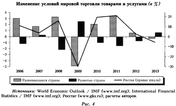 Ухудшались и условия функционирования российских хозяйствующих субъектов, не только специализирующихся на экспорте товаров и услуг, но и использующих импортные сырье, промежуточные товары и оборудование. Ухудшение условий торговли для России и других развивающихся стран стало следствием снижения как спроса крупнейших развитых стран, так и объемов мировой торговли. Если в 2011-2012 гг. на мировых рынках еще сохранялись позитивные ценовые тренды, то в 2013 г. для развивающихся стран индикатор условий торговли перешел в отрицательную область (-0,3%). Аналогичные тренды характерны и для российской экономики, где соотношение динамики цен и тарифов на экспортируемые и импортируемые товары и услуги, устойчиво снижаясь, в 2013 г. также стало отрицательным (-5,6%). Схожая ситуация в развивающихся странах и России наблюдалась только в кризисном 2009 г., когда индикаторы условий торговли для них также перешли в область отрицательных значений (-4,9 и -29,8% соответственно) (рис. 4).