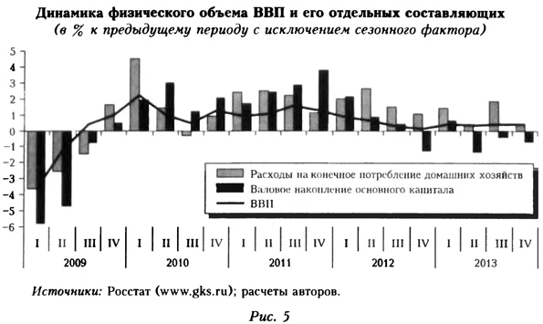 Нараставший пессимизм российских субъектов хозяйствования отразил и сформировавшийся в 2011 г. нисходящий тренд опережающего индикатора деловой активности в промышленности. Его значение, достигнув максимума 54,8 п. в I квартале, в III квартале опустилось ниже критической отметки 50 п., что предвещало спад деловой активности. С IV квартала 2011 г. началось устойчивое замедление динамики производства, в дальнейшем переросшее в затяжную стагнацию. Если в 2012 г. среднеквартальный темп прироста ВВП достигал почти 0,5% (с исключением сезонности), то в 2013 г. он снизился до 0,4% (в аналогичном измерении). Это торможение было вызвано сначала ослаблением инвестиционной активности, а затем — ее сокращением. Начавшийся в IV квартале 2012 г. инвестиционный спад уже со II квартала 2013 г. принял устойчивый характер. За три последних квартала 2013 г. объем валового накопления основного капитала сократился на 2,4% (рис. 5).