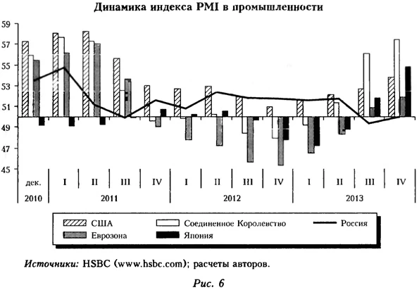 Несмотря на устойчивый инвестиционный спад и погружение российской экономики в стагнацию, экономическая политика и ее монетарная составляющая не смогли оказать стимулирующее воздействие на хозяйственную деятельность. Среднегодовая динамика денежного предложения в 2011-2013 гг. замедлилась более чем в 4 раза — до 8,6% по сравнению с 32,3°о в докризисные 2005-2007 гг. В результате относительная величина активов Банка России снизилась до 33,3% ВВП к концу 2013 г. (максимальное докризисное значение на конец 2008 г. — 41,1% ВВП). Противоположная ситуация складывалась в развитых странах, где регуляторы, запустив механизмы монетарного стимулирования, смогли во многом компенсировать негативные последствия кризиса. Эффект монетарной политики развитых странПосле преодоления острой фазы кризиса в конце 2008 — начале 2009 г. в развитых экономиках наступила некоторая стабилизация, при этом докризисный уровень производства удалось восстановить только в США — в 2011 г. Но затем и США, и другие ведущие экономики мира — еврозона, Япония и Великобритания вновь ощутили негативные последствия кризиса. Набиравшие силу пессимистические настроения деловых кругов развитых стран отражал нисходящий тренд опережающих индикаторов деловой активности, значения которых уже во второй половине 2011 г. опустились ниже критической отметки 50 п. Так, в ноябре индекс деловой активности в промышленности еврозоны, рассчитываемый HSBC, снизился до минимального за два года значения — 48,9 п. (в ноябре 2009 г. — 48,1 п.), в Великобритании — до 49,4 п. (в октябре 2009 г. — 49,3 п.). Негативные ожидания преобладали и в деловых кругах США. Индекс PMI в промышленности, достигнув в апреле 2011 г. максимума — 58,8 п., за год устойчивого снижения опустился в марте 2012 г. до отметки 52,6 п. (рис. 6).