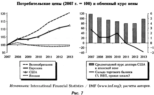 Стремясь оживить потребительскую и инвестиционную активность, монетарные власти развитых стран, снизив ключевые процентные ставки до реально отрицательных значений и инициировав массированное приобретение долгосрочных финансовых активов, воздействовали не только на стоимость краткосрочных и долгосрочных финансовых ресурсов, но и на цены нефинансовых активов. Традиционно основным каналом трансмиссионного механизма монетарной политики считается процентный, посредством которого монетарные власти, регулируя ключевые процентные ставки и стоимость денег в Экономикс, воздействуют на воспроизводственные процессы. Изменяя своп краткосрочные процентные ставки, центральные банки влияют на уровень не только краткосрочных, но и долгосрочных ставок В результате регулирующее воздействие монетарных властей сказывается на параметрах воспроизводства, текущей и инвестиционной деятельности. В современных условиях для развитых стран актуальны вопросы, связанные с влиянием монетарной политики па динамику финансовых рынков, рынков недвижимости и покупок товаров длительного пользования (канал цен активов). С увеличением денежного предложения возрастают цены акций корпоративного сектора и соответственно балансовая стоимость активов потенциальных заемщиков, что расширяет их возможности привлекать финансовые ресурсы, в том числе для финансирования инвестиций. При этом, как показывают исследования, проведенные в середине 1990-х годов, то есть в преддверии кредитного бума и формирования «пузыря» на финансовом рынке США, цены активов более чувствительны к изменению динамики денежного предложения, чем процентные ставки (Bernanke, Gcrtler, 1995). Мягкая монетарная политика, проводившаяся в докризисный и посткризисный периоды и сопровождавшаяся низкими процентными ставками денежного рынка и масштабной денежной экспансией, подстегивала инвесторов к поиску инструментов вне банковской системы, приносящих наибольшую доходность. В таких условиях более привлекательными становятся фондовые рынки и рынки недвижимости, поскольку соответствующие вложения обеспечивают более высокую доходность. Кроме того, выгодны и покупки товаров длительного пользования. Из этих предпосылок исходит стимулирующая монетарная политика развитых стран. Увеличивая дюрацию портфеля ценных бумаг и выкупая долгосрочные финансовые активы, монетарные власти стимулировали инвестиционную активность, которая значительно снизилась в кризис. Вслед за ФРС США, первой инициировавшей масштабное приобретение долгосрочных казначейских облигаций, а затем — и долговых ипотечных ценных бумаг (Gertler, Karadi, 2013), центральные банки Англии и Японии, снизив до предельно низких уровней свои ключевые процентные ставки, были вынуждены прибегнуть к нестандартным мерам монетарной политики. В результате за время кризиса и посткризисного восстановления — с конца 2008 по конец 2013 г. — активы Банка Англии возросли с 12,5 до 23,5% ВВП, а ФРС США - с 15,3 до 24,5% ВВП. Но максимальной отметки среди развитых стран достигли активы Банка Японии, увеличившись за этот период с 25,7 до 49,3% ВВП. Беспрецедентные по объему программы количественного и кредитного смягчения Банка Японии, помимо традиционного стимулирующего эффекта, были призваны решить и другие задачи. Во-первых, Япония — мировой рекордсмен по 