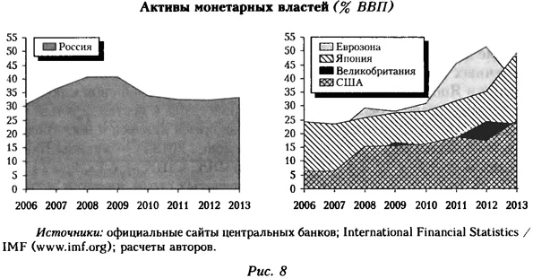 Только в еврозоне активы регулятора за 2013 г. снизились с 51,6 до 38,1% ВВП. Это было обусловлено как возобновлением экономического роста, так и погашением кредитными организациями части задолженности, особенно по долгосрочным заемным средствам (рис. 8).
