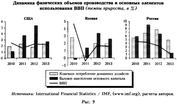 Как следствие, монетарным властям США и Японии, наиболее активно задействовавшим стимулирующие программы, несмотря на вялый экономический рост, удалось повысить инвестиционную привлекательность национальных экономик и обеспечить опережающие темпы роста валового накопления основного капитала. Так, в США в 2011-2013 гг. при среднегодовом приросте ВВП на 2% объем валового накопления основного капитала увеличивался на 4%. Аналогичная ситуация и в японской экономике: при среднегодовом росте производства в этот период на 0,8% валовое накопление основного капитала возрастало на 2,5%. В российской экономике, напротив, именно сокращение инвестиционной активности, отражающее перспективы долгосрочного вложения финансовых ресурсов, первым отреагировав на негативные процессы и формирующиеся риски, повлекло за собой снижение общеэкономической динамики (рис. 9).
