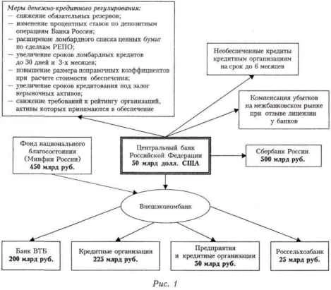 В 2008 г. денежные власти осуществляли масштабные вливания ликвидности в банковский сектор. Если в 1998 г. масштабы помощи, оказываемой банковскому сектору, носили ограниченный характер, а инструментарий пополнения денежной базы был представлен преимущественно снижением размера резервных требований и кредитами банковской системе для «расшивки» неплатежей, то в 2008 г. поток пополнения ликвидности был более «полноводным» и разнообразным. Наряду с расширением традиционных каналов рефинансирования (за счет как увеличения ломбардного списка, так и использования новых форм рефинансирования, например валютных свопов) появились принципиально новые инструменты (беззалоговые кредиты, депозиты, предоставляемые правительством РФ, субординированные кредиты Сбербанку России и др.). К особой форме поддержки следует отнести предоставление валютных депозитов Банком России Внешэкономбанку под выделение кредитов российским компаниям (см. рис. 1). Масштабная помощь экономике в целом и банковскому сектору в частности не может не вызывать одобрения, однако следует отдавать отчет в том, что кредитами можно сгладить остроту финансового кризиса, но ликвидировать его причины нельзя. Организации, столкнувшиеся с резким снижением спроса на свою продукцию (а это большинство компаний в силу повсеместной зависимости от экспортных поступлений), будут стремиться к сокращению производства' и снижению издержек, в том числе на обслуживание кредита. Ссуды необходимы им лишь для латания текущих дыр в поступлениях, расчетов с поставщиками и бюджетом, выплат заработной платы и т. д. С точки зрения спроса, предъявляемого ими на рынке, а также решений о сокращении персонала данные кредиты ничего не меняют. Важен общий уровень спроса в экономике. Если он снижается, причем повсеместно, а следовательно, падает рентабельность производства, кредит сам по себе, независимо от его объема, не повлияет на изменение экономических пропорций. Скорее в условиях отрицательных реальных процентных ставок появятся возможности для спекуляций, например посредством вложения кредитов в товарные ценности с целью их последующей перепродажи. Еще одно направление использования дешевого кредита — масштабный передел собственности. Ведь за заемные деньги во время кризиса можно легко «перекупить» испытывающих финансовые трудности конкурентов. Но и здесь кредит не способен стимулировать конечный спрос. Рассчитано по табл. «График предстоящих выплат по внешнему долгу Российской Федерации по состоянию на 1 июля 2008 г.: проценты» (www.cbr.ru/statistics/credit_ statistics/scheduleint.htm) и «График погашения внешнего долга Российской Федерации по состоянию на 1 октября 2008 г.: основной долг» (http://www.cbr.ru/statistics/credit_ statistics/schedule_debt.htm). Основные каналы финансовой поддержки банковского и реального секторов Российской Федерации в 2008 г. в соответствии с Федеральным законом «О дополнительных мерах но поддержке финансовой системы Российской Федерации» от 29.10.2008 г. № 173 ![]() Кроме того, в российской денежной системе образца 2008 г. в силу явного перекоса в сторону сферы обращения значительно возросла скорость обращения денег. Они оказались исключены из длительных производственных циклов с финансированием запасов сырья и готовой продукции; основа их обращения — обслуживание коротких цепочек «экспортная выручка —> валют