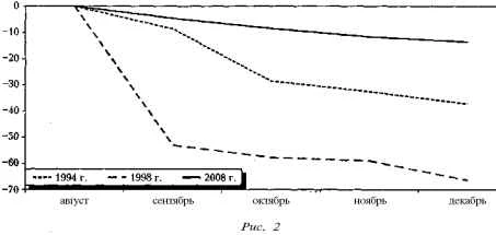 Таким образом, можно сделать вывод о том, что, в отличие от кризиса 1998 г., в большей степени порожденного обвалом валютного курса, кризисные явления 2008 г. носят преимущественно системный характер. Международный финансовый кризис лишь обострил и выявил глубокие диспропорции национального хозяйства. Исходя из системного характера данного кризиса, сама возможность выхода из него представляется иллюзорной. Российская экономика просто возвращается в свою колею развития. По нашему мнению, в ближайшие годы следует ожидать постепенного восстановления пропорций хозяйства, которые позволят ему найти новый равновесный уровень с более низким объемом производства. Отечественная экономика, по-видимому, будет вынуждена совершить «жесткую посадку» и выйти на свой реальный уровень развития производительных сил, осознав истинную роль в международной системе разделения труда. Вывод «горячих» капиталов постепенно обнажает все накопившиеся в экономике России воспроизводственные проблемы. Их разрешение займет долгие годы, в течение которых вряд ли можно будет рассчитывать на помощь извне. Нам придется смириться с тем, что наши услуги недостаточно качественны, а продукты не очень востребованы и, следовательно, мы не можем за них много получать; нам предстоит привыкнуть к более низким зарплатам и сокращению потребления. В отличие от 1998 г., сценарий кризисных явлений 2008 г. носит более мягкий характер. Нет обвального падения курса рубля, дефолтов и мораториев, но есть готовность и желание выполнять все внешние обязательства и реализовывать антикризисные меры. Однако в 2008 г. появились мощные системные ограничения их эффективности. Вероятно, в ближайшие годы мы уже не сможем наладить импортозамещающие производства по причине отсутствия как трудовых, так и материальных ресурсов; нам вряд ли удастся уменьшить зависимость от международного рынка капитала, поскольку мы не в состоянии собственными силами обслуживать внешний долг; нам, по-видимому, будет очень сложно решить так же безболезненно, как в 1998 г., проблему трудоустройства многочисленной армии безработных, которые в последние годы участвовали в цепочках перераспределения продукта, создаваемого в экспортных отраслях. России придется заново формировать национальные фонды, восстанавливать профессионально-техническое образование, развиваться в условиях крупного внешнего долга.