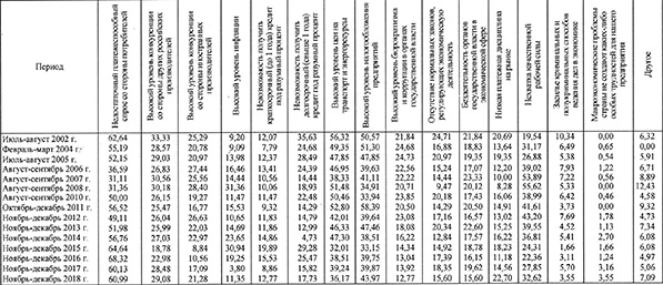 Д.Б. Кувалин Во второй половине 2018 г. российская экономика продолжила свой рост. При этом динамика основных макроэкономических показателей оставалась очень умеренной. По оценкам Росстата, валовой внутренний продукт за первые три квартала 2018 г. вырос на 1,6%, объем инвестиций в основной капитал -на 4,1%. При этом индекс прироста промышленного производства за 11 мес. 2018 г. составил 2,9%, грузооборота транспорта - 2,7%, а прирост аграрного производства оказался отрицательным (-0,2%) [1]. Несмотря на относительно низкие темпы экономической динамики, тенденцию к росту производства в России можно считать устойчивой, поскольку практически все ключевые индикаторы развития страны находятся в зоне положительных значений второй год подряд. В то же время, как показывают данные очередного опроса отечественных предприятий, проведенного Институтом народнохозяйственного прогнозирования РАН2 2, улучшение ситуации в российской экономике нельзя назвать фронтальным. Положительные сдвиги в одних случаях сочетаются с сохранением неблагоприятных тенденций в других. В частности, оценивая макроэкономические проблемы, российские предприятия в качестве наиболее сложной для себя по-прежнему чаще всего называют недостаток платежеспособного спроса - 60,99% ответов. Это несколько ниже, чем в 2015-2016 гг., но примерно на том же уровне, что в 2017 г., и заметно выше, чем в 2010-2014 гг. Иными словами, положение дел с платежеспособным спросом в российской экономике улучшается крайне медленно. Второй по частоте упоминаний стала проблема высокой налоговой нагрузки - 43,97% ответов. Это на 4 проц. п. больше, чем в 2016-2017 гг. Таким образом, спорные решения финансовых властей по явному и скрытому увеличению налогов уже начали сказываться на деятельности предприятий. Кроме того, снова стали чаще упоминаться такие проблемы, как невозможность взять кратко- или долгосрочный кредит, высокая инфляция, высокий уровень конкуренции со стороны иностранных производителей и, довольно неожиданно, низкая платежная дисциплина на рынке. В то же время в 2018 г. немного реже упоминались такие проблемы, как высокий уровень цен на энергоресурсы и транспорт, бездеятельность органов государственной власти, а частота упоминаний бюрократизма и коррупции достигла минимального уровня за весь период проведения опросов - 12,77%. Увеличение числа жалоб на нехватку качественной рабочей силы до 32,62% также можно считать косвенным признаком улучшения производственной ситуации, так как при прочих равных условиях это свидетельствует о намерениях предприятий увеличивать объем выпуска (табл. 1). Таблица 1 Ответы на вопрос: «Какие проблемы макроэкономического характера создают в настоящее время наибольшие трудности для Вашего предприятия?» (сумма ответов>100%)