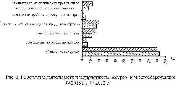 Главный результат ресурсо- и энергосбережения для российских предприятий -снижение издержек производства (92,57% ответов в 2012 г. и 90,15% в 2018 г.). Второй по частоте упоминаний ответ - снижение объемов отходов и вредных выбросов (16,89% в 2012 г. и 20,45% в 2018 г.). Еще реже упоминались улучшение условий труда, уменьшение экологических претензий со стороны властей и общественности, повышение качества продукции (рис. 2). Подобное распределение ответов свидетельствует о том, что собственно экономические мотивы ресурсо- и энергосбережения пока продолжают доминировать, а экологические и социальные мотивы в целом остаются для российских предприятий второстепенными.