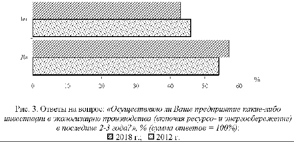 Тем не менее, более частое указание на экологические и социальные результаты ре-сурсо- и энергосбережения в 2018 г. по сравнению с 2012 г. подтверждает постепенное увеличение внимания российских предприятий к вопросам «зеленой» экономики и устойчивого развития. В пользу этого предположения говорит и тот факт, что в 2018 г. по сравнению с 2012 г. доля предприятий, осуществлявших инвестиции в экологизацию производства, несколько возросла, достигнув 57,04% (рис. 3).