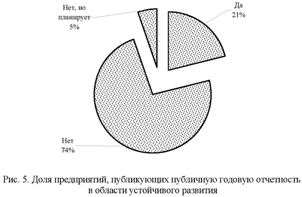 В некоторых случаях общее внимание к ЦУР сочетается с практическими действиями предприятий. В частности, в настоящее время уже 21,05% опрошенных предприятий представили публичную годовую отчетность в области устойчивого развития (рис. 5). Однако при этом 11% респондентов публикуют годовую отчетность и считают важным учитывать ЦУР в своих стратегиях развития, а 10% опрошенных предприятий публикуют годовую отчетность, но не считают важным учитывать в своих стратегиях развития глобальные ЦУР.