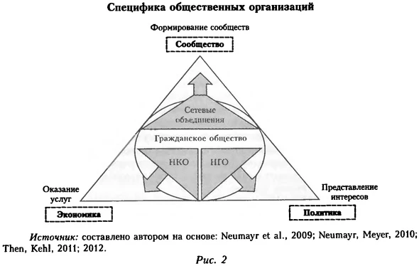 В экономическом развитии России реальная ресурсная зависимость сочетается с провозглашенным курсом на инновационную экономику (Inozemtsev, 2009; Schwab, 2012), что влияет на формирование профессиональных объединений. Наконец, на них воздействует и модель гражданского общества. Находясь в состоянии отложенного перехода к демократизации, хотя социальное партнерство официально провозглашено как принцип межсекторной работы (Семененко, 1998; Иванов, 2005; Якимец, Никовская, Коновалова, 2004), гражданское общество характеризуется замедленным развитием и отсутствием четкой структурированности (Howard, 2003; Yakobson et al., 2011). При этом единственным каналом обратной связи профессиональных объединений с внешней средой (обозначен на рис. 1 нижним блоком стрелок) выступает накопленный организационный потенциал (выраженный прежде всего через репутационный капитал организаций), позволяющий руководству объединений выступать в качестве возможных агентов изменений. Последующий анализ будем вести в рамках теории функций общественных организаций (Salamon, Hems, Chinnock, 2000; Warren, 2001; Frumkin, 2005; Kendall, 2003; Neumayr, Meyer, 2010), раскрывающей специфику общественных организаций как набор отличительных функций, которые эти организации выполняют. Некоторые авторы различают общественные объединения по степени формализации — от формализованных некоммерческих и негосударственных организаций до менее формализованных сетевых объединений, в совокупности образующих гражданское общество (Then, Kehl, 2011; 2012). Согласно теории социальных систем Лумана (Luhmann 1984; 1998) вклад этих организаций в общественное развитие осуществляется в рамках трех взаимосвязанных функциональных подсистем — экономической, политической и общественной — через набор из трех соответствующих им функций — оказание услуг, представление интересов и формирование сообществ (рис. 2).