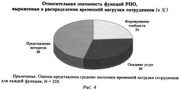Примечание. * Цели — распределение относительной значимости функций РПО, выраженных в целях организации. ** Время — распределение относительной значимости функций РПО, выраженных в распределении временной нагрузки сотрудников. Как следует из таблицы 3, для принявших участие в опросе бизнес-ассоциаций и посреднических объединений наиболее приоритетной остается осуществляемая посредством вертикально направленных коммуникаций функция представления интересов членов. Это подтверждается с точки зрения как выражения представительской функции при формулировании организационных целей, так и временных затрат. Для творческих профессиональных сообществ наиболее приоритетной функцией, осуществляемой посредством горизонтальных коммуникаций, является (с точки зрения целей) формирование сообществ, а с точки зрения времени, затрачиваемого на выполнение этой функции, для этого вида объединений приоритетна представительская функция. Среди всех выделенных типов профессиональных объединений они более всего сосредоточены на функции формирования сообществ, как с точки зрения целей (42%), так и по объему времени (30%) на выполнение этой функции. В целом функция представления интересов наиболее приоритетна для всех типов объединений, но особенно ярко она выражена в случае бизнес-ориентированных объединений, а в деятельности творческих профессиональных организаций больше уклон в сторону формирования сообществ.