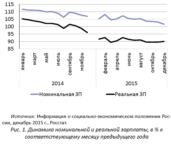 Основным механизмом адаптации рынка труда к текущему кризису, так же как и к предыдущим, стала гибкость заработных плат. В результате высокой инфляции в конце 2014 г. - начале 2015 г. реальная заработная плата упала на 9,5%, оставшись на прежнем уровне в номинальном выражении. Существенное снижение затрат на рабочую силу позволило работодателям сохранить работников, и рост безработицы оказался минимальным. Основным фактором подстройки рынка труда, как и в предыдущие периоды спада экономики, оказалась динамика заработной платы. Резкое ускорение инфляции в конце 2014 г. - начале 2015 г. привело к тому, что работодателям для существенного снижения издержек по оплате труда достаточно было не повышать номинальные заработные платы. По предварительной оценке Росстата, среднемесячная начисленная заработная плата в 2015 г. составила 33925 руб., что на 4,6% выше, чем в 2014 г. Причем в некоторых видах экономической деятельности ее рост оказался еще ниже: в финансовой деятельности она выросла всего на 0,2%, в строительстве - на 1,8%, а в государственном управлении и обеспечении военной безопасности, также как и в социальном страховании номинальные заработные платы даже снизились на 0,9%. Наибольший рост заработных плат наблюдался в сельском хозяйстве и рыболовстве, т.е. в тех отраслях, которых кризис коснулся в наименьшей степени. Незначительный рост зарплат в номинальном выражении при высоком уровне инфляции привел к тому, что в реальном выражении в 2015 г. они снизились в среднем на 9,5%. Это гораздо более серьезный спад по сравнению с предыдущим кризисом, когда при падении ВВП на 7,8% в 2009 г. реальные заработные платы упали всего на 3,5%. Помесячная динамика показывает, что темпы роста номинальных заработных плат постепенно снижались в течение 2014-2015 гг., и к концу рассматриваемого периода их рост практически прекратился (рис. 1). Так, в декабре 2015 г. заработные платы в номинальном выражении были лишь на 1,6% выше, чем в декабре 2014 г.