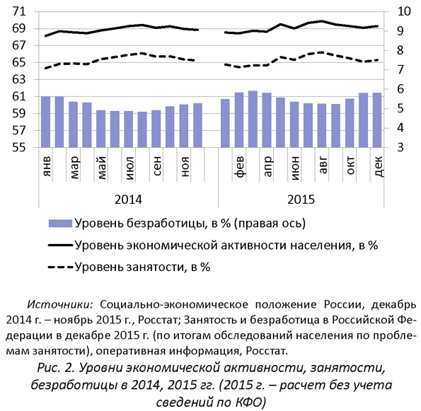 Снижение реальных заработных плат в результате ускорения инфляции привело к тому, что работодателям почти не пришлось пока прибегать ни к каким другим механизмам сокращения издержек на оплату труда. По предварительным оценкам Росстата, в 2015 г. по сравнению с 2014 г. численность экономически активного населения выросла (без учета Республики Крым и города Севастополь) на 1,2 млн человек, а уровень экономической активности - на 0,3 п.п. В условиях роста численности рабочей силы показатели занятости сохранились на уровне 2014 г., а уровень безработицы, определяемый согласно методологии МОТ, повысился за год всего на 0,4 п.п. В первую очередь рост численности экономически активного населения был обусловлен увеличением этого показателя среди городского населения. Регистрируемая безработица также оказалась лишь немногим выше уровня 2014 г.