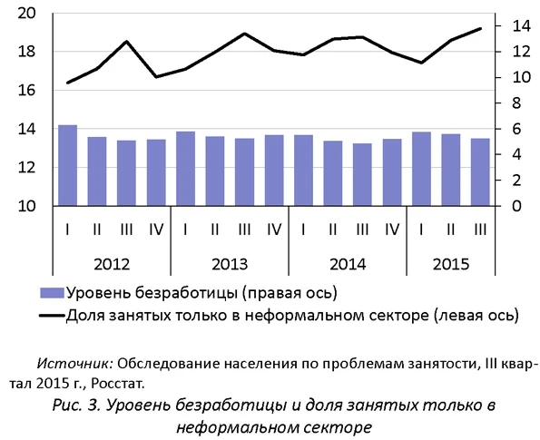 Таким образом, спад в экономике практически не повлек за собой роста безработицы. Это отличает текущую ситуацию от прошлого кризиса 2007-2009 гг., когда уровень безработицы вырос на 2,7 п.п. Доля работающих неполный рабочий день (менее 30 часов в неделю) и временно отсутствовавших на работе увеличилась незначительно - с 8,3% за первые три квартала 2014 г. до 8,8% за этот же период 2015 г. Переход в неформальный сектор зачастую является одним из способов избежать безработицы. Поэтому обычно эти показатели имеют разнонаправленную динамику (рис. 3). Имеющиеся данные Росстата за I-III кв. 2015 г. показывают, что доля занятых только в неформальном секторе сохраняется на уровне 2014 г. (впрочем, в III кв. наметился небольшой рост).
