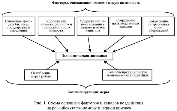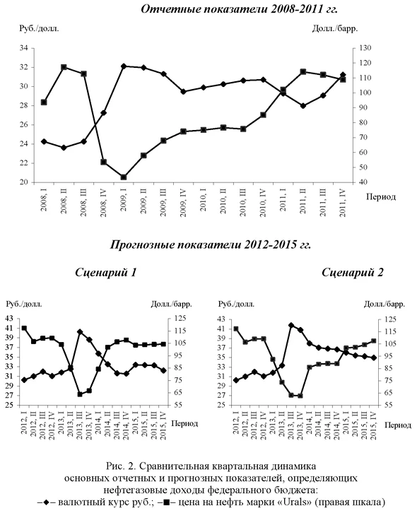 Балансировка показателей проводилась на основе итерационной процедуры согласования основных бюджетных показателей с учетом так называемых поправочных коэффициентов, которые в разработках Минфина России обозначаются как «повышение собираемости». При этом оценивалась достаточность накопленных средств Резервного фонда для покрытия возникающего незапланированного дополнительного дефицита консолидированного бюджета РФ, соответствующего прогнозируемому сокращению доходов по сравнению с их плановой величиной. Сокращение бюджетных доходов от приватизации оценивалось экспертно на основании общих данных о падении рыночной стоимости активов в условиях прогнозируемого экономического кризиса. При этом, например в Сценарии 1, исходя из предпосылки об окончании кризиса в 2014 г., сокращенные в 2013-2014 гг. суммы добавлялись к плановым доходам в 2015 г. (т.е. сдвигались во времени). Анализ влияния мирового кризиса 2007-2009 гг. на российскую бюджетную систему показал следующее. Исходя из помесячной динамики мировых цен на нефть, валютного курса рубля и бюджетных поступлений, можно считать, что бюджетный кризис продолжался ровно год - с октября 2008 до ноября 2009 г. При этом наблюдались временные интервалы (примерно по три месяца), которые различались по уровню цен на нефть и соответственно по курсу рубля и поступлению нефтегазовых доходов. Поэтому для Сценария 1 (краткосрочный кризис) была также выбрана годовая продолжительность кризиса (апрель 2013 г. - март 2014 г.) с выделением квартальных периодов, которые можно условно назвать: «фаза вхождения в кризис», «острая фаза кризиса» и «фаза выхода из кризиса», которая объединяет два квартала. В сценарии приняты менее резкие темпы изменения валютного курса рубля и цен на нефть по сравнению с 2008-2009 гг. При этом в обоих сценариях помимо падения цен на нефть предполагается падение внешнеэкономического спроса на 15% (в физическом измерении). В Сценарии 1 это падение длится примерно три квартала, а в Сценарии 2 - полтора года. Оценивая перспективы развития российской экономики в рамках рассматриваемых сценариев, следует учитывать, что негативному воздействию кризиса на российскую экономику будут противостоять естественные «демпферы», позволяющие существенно смягчить его последствия. Один из них - изменение валютного курса рубля. Очевидно, что в условиях снижения экспортных цен и уменьшения физических объемов экспорта будет снижаться поток валюты, попадающей на валютный рынок. Следовательно, при прочих равных условиях, становится неизбежным ослабление реального курса рубля, степень которого может быть определена путем сопоставления динамики экспорта, мировых цен на нефть и уровня инфляции в стране. Ослабление рубля позволяет увеличить номинальную часть доходов бюджета, а также приведет к сокращению импорта и снижению степени его давления на экономическую динамику. Другими механизмами снижения негативных последствий мировой экономической нестабильности являются финансовые вливания в экономику из резервных фондов, наращивание уровня банковской ликвидности и иные мероприятия, связанные с прямым или косвенным замещением выпадающего спроса, инициированные государством. В рамках таких гипотез в 2013 г. средний уровень цен на нефть марки Urals при реализации Сценария 1 опускается до уровня 80 долл./б