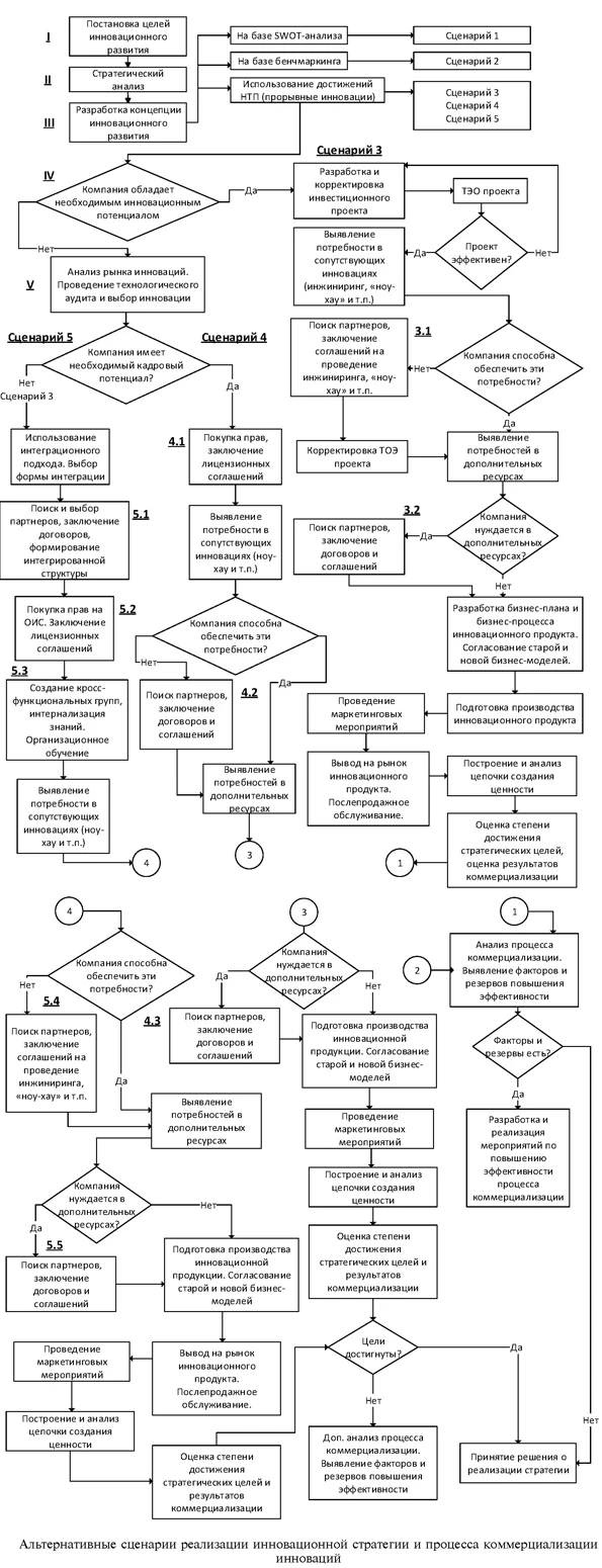 Выбор первого или второго из альтернативных вариантов соответствуют сценарию 1 или 2 соответственно. Эти сценарии могут рассматриваться исходя из представлений о том, что реализация инновационной стратегии требует, как правило, изменений в направлении совершенствования и развития менеджмента организаций, которые по сути своей также являются инновациями. Одним из методов решения данной задачи является изучение опыта компаний — лидеров разных отраслей, получившее название бенчмаркинг. Изучение опыта, как показывает практика, может дать много новых идей, но требует творческого отношения к чужому опыту. Он может служить источником появления инновационных проектов или условием реализации основной инновационной идеи. Важно правильно выбрать базу для сравнения, а также вывести на рынок новшество раньше конкурентов. Выбор вариантов, основывающихся на использовании достижений научно-технического прогресса, ориентирован на сценарии 3-5 и предусматривает проведение дальнейших этапов сценарного планирования. На следующем этапе (IV) проводится оценка инновационного потенциала предприятия. В качестве базового определения инновационного потенциала используем определение, приведенное в работе Р. Гранта [6, с. 356], где под инновационным потенциалом понимаются динамические способности «интегрирования, создания и реконфигурации внутренних и внешних компетенций для соответствия быстро изменяющейся среде». Разработка нового товара охватывает все области функционального и технического опыта компании. Это определяет инновацию, связанную с выводом на рынок нового продукта, как кооперативную деятельность, которая требует взаимодействия и сотрудничества между отделами технологического развития, производства, маркетинга и другими функциональными подразделениями фирмы. Если компания обладает необходимым инновационным потенциалом, то может быть реализован сценарий 3. Его сущность и содержание соответствуют традиционному процессу разработки и реализации инновационного проекта. Типовые шаги и процедуры данного процесса отражены на схеме. Использование данного сценария требует максимального времени на реализацию стратегии, так как предусматривает выполнение всех стадий НИОКР. Для ускорения реализации проекта и при необходимости использования дополняющих инноваций типа инжиниринг, ноу-хау и т. п. может предусматриваться привлечение сторонних разработок или специалистов (п. 3.1). Это требует поиска партнеров, заключения договорных соглашений, которые связаны с дополнительными транзакционными издержками, что является существенным фактором формирования результатов коммерциализации. Дальнейший анализ в рамках данного сценария может показать, что реализация проекта связана с необходимостью привлечения дополнительных ресурсов. Чаще всего это инвестиционные ресурсы. В качестве инвесторов могут быть привлечены венчурные фонды или компании, инвестиционные банки, частные инвесторы. В каждом из указанных вариантов процедуры привлечения инвестиционных ресурсов существенно отличаются и требуют проведения переговоров, выбора вариантов, заключения договоров. Это также увеличивает затраты на проект как за счет стоимости привлекаемых ресурсов, так и транзакционных издержек. Одним из ключевых этапов данного сценария явля