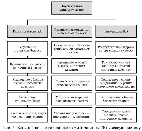 Эта платформа позволяет собрать ипотечные пулы разных банков и объединить их в одну сделку. При этом банк имеет возможность принять участие в сделке с тем объемом портфеля ипотечных кредитов, который он накопил на данный момент. Сделка будет структурирована таким образом, что каждый оригинатор получит разную доходность в зависимости от качества пула, который он принес в покрытие. АИЖК выработало такую схему, при которой каждый оригинатор несет риски только своего пула закладных. Наибольшее распространение коллективная секъюритизация (или МОС) может получить в результате сотрудничества региональных банков. Влияние коллективной секъюритизации на банковскую систему отражено на рис. 5.