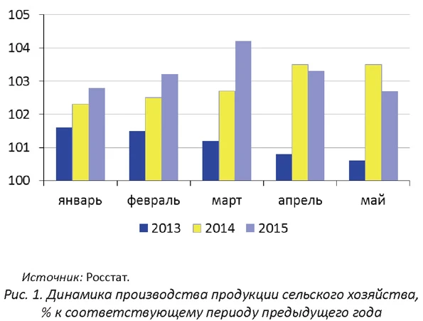 Темпы прироста производства в сельском хозяйстве в апреле-мае 2015 г. замедлились (с 4,2% в марте до 2,7% в мае). Наблюдается сокращение внутреннего спроса: оборот розничной торговли продовольственными товарами составлял в апреле-мае 91,2-91,3% к аналогичному периоду 2014 г. На фоне столь резкого сжатия внутреннего спроса на продовольствие даже сокращающиеся темпы прироста в сельском хозяйстве свидетельствуют о том, что определенные процессы импортозамещения имеют место - доля отечественного производства на внутреннем рынке увеличивается. Предварительные итоги посевной показывают, что размер площадей в целом сохранился на уровне прошлого года, за исключением картофеля и овощей, площади под которые увеличились в 1,5 раза. Вместе с тем рост цен на ресурсы (прежде всего - удобрения) мог привести к сокращению их использования даже при сохранении размеров площадей. В этом случае валовой сбор может оказаться меньшим, чем в предыдущие годы. Сельскохозяйственное производствоВ апреле-мае темпы роста в сельско-хозяйственном секторе замедлились. Как видно на рис. 1, в I кв. 2015 г. темпы роста были выше, чем в предыдущем году, однако затем наступил перелом, ставший особенно явным по итогам мая 2015 г.